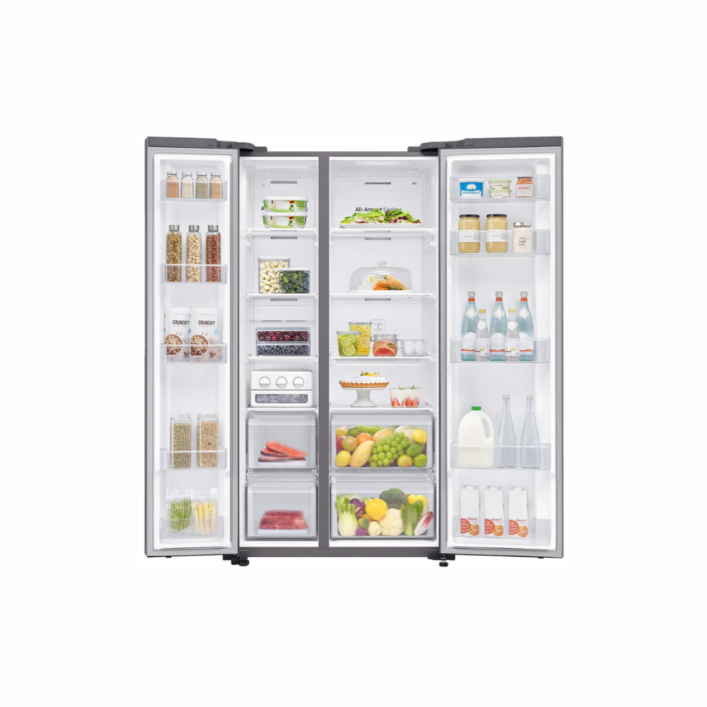 التصميم الخارجي باللون الفضي يمنح لمسة راقية لأي مطبخ، بينما تتيح الأبواب المزدوجة (Side by Side) الوصول السهل والسريع إلى جميع الأطعمة. تتميز الثلاجة بلوحة تحكم رقمية دقيقة لتعديل درجة الحرارة، وإضاءة داخلية LED قوية توفر رؤية واضحة لكل زاوية. الأرفف الزجاجية القابلة للتعديل تمنح مرونة عالية في التخزين، وتتحمل الأوزان الثقيلة دون قلق.